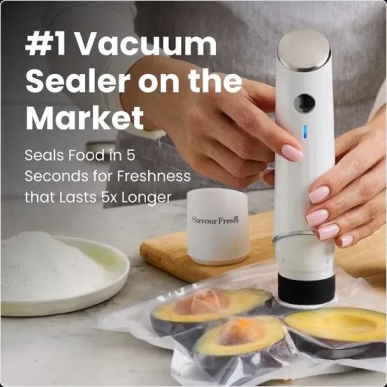 SavourFresh is a handheld vacuum sealer that locks in freshness and flavor. Paired with reusable, odor‑free bags, it helps organize your freezer and fridge while cutting food waste.